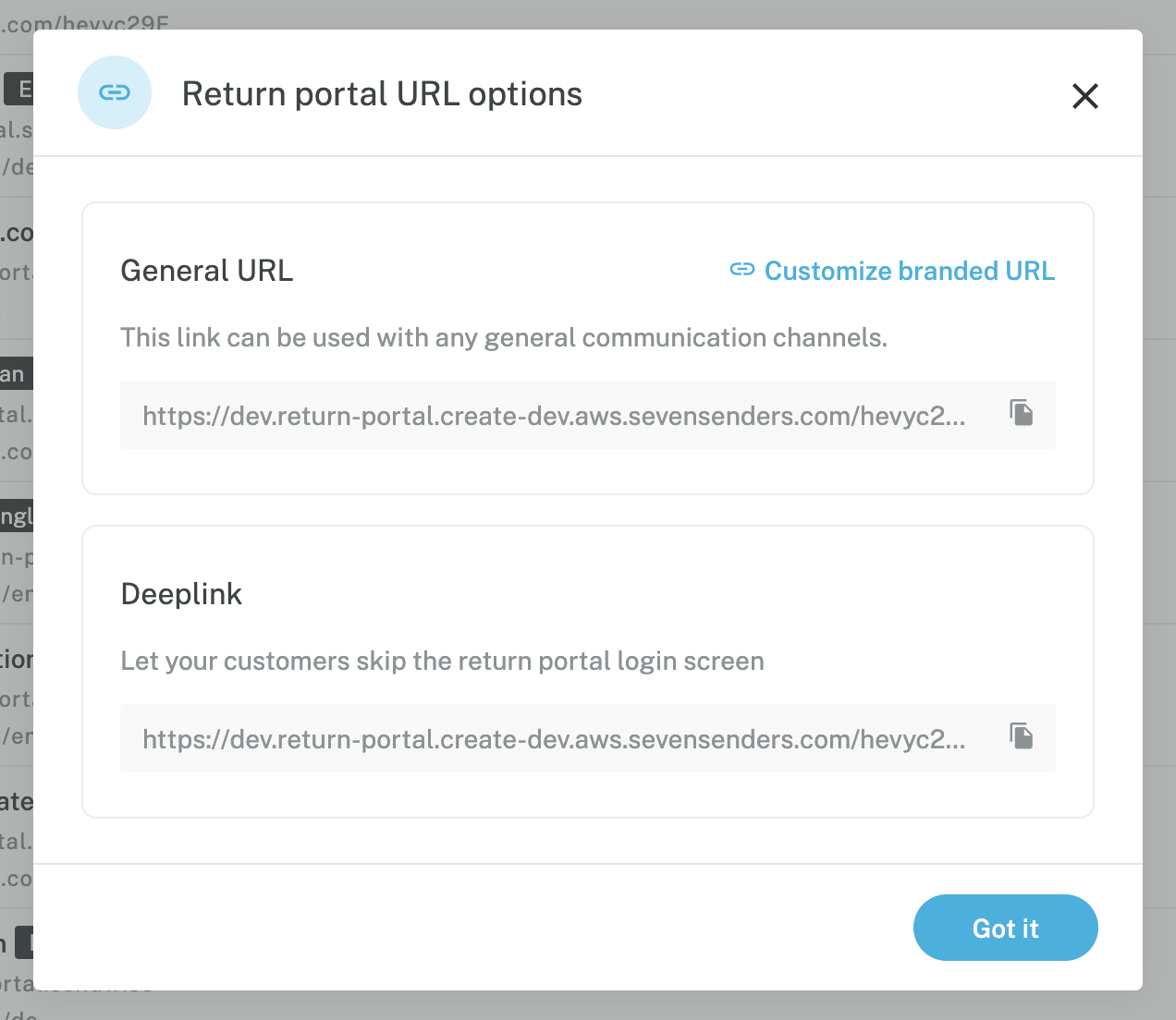 Once you have published your return portal you will be able to use the standard or deep link URL we create for you or create a customised URL instead. Please see this support article for more information on how to add a return portal to your website using a deeplink. You can access the URL options by clicking the option button (3 dots) on each return portal.