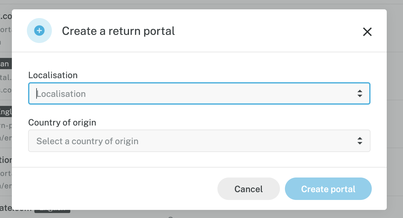 Once you click Create a return portal, a pop up will appear asking you to select a country and a localisation (to learn how to set up a localisation check this article). The country will be used to determine from which country are the returns coming from, meaning, the sender address country in the label. The localisation will be used to determine the default language of the Return Portal.