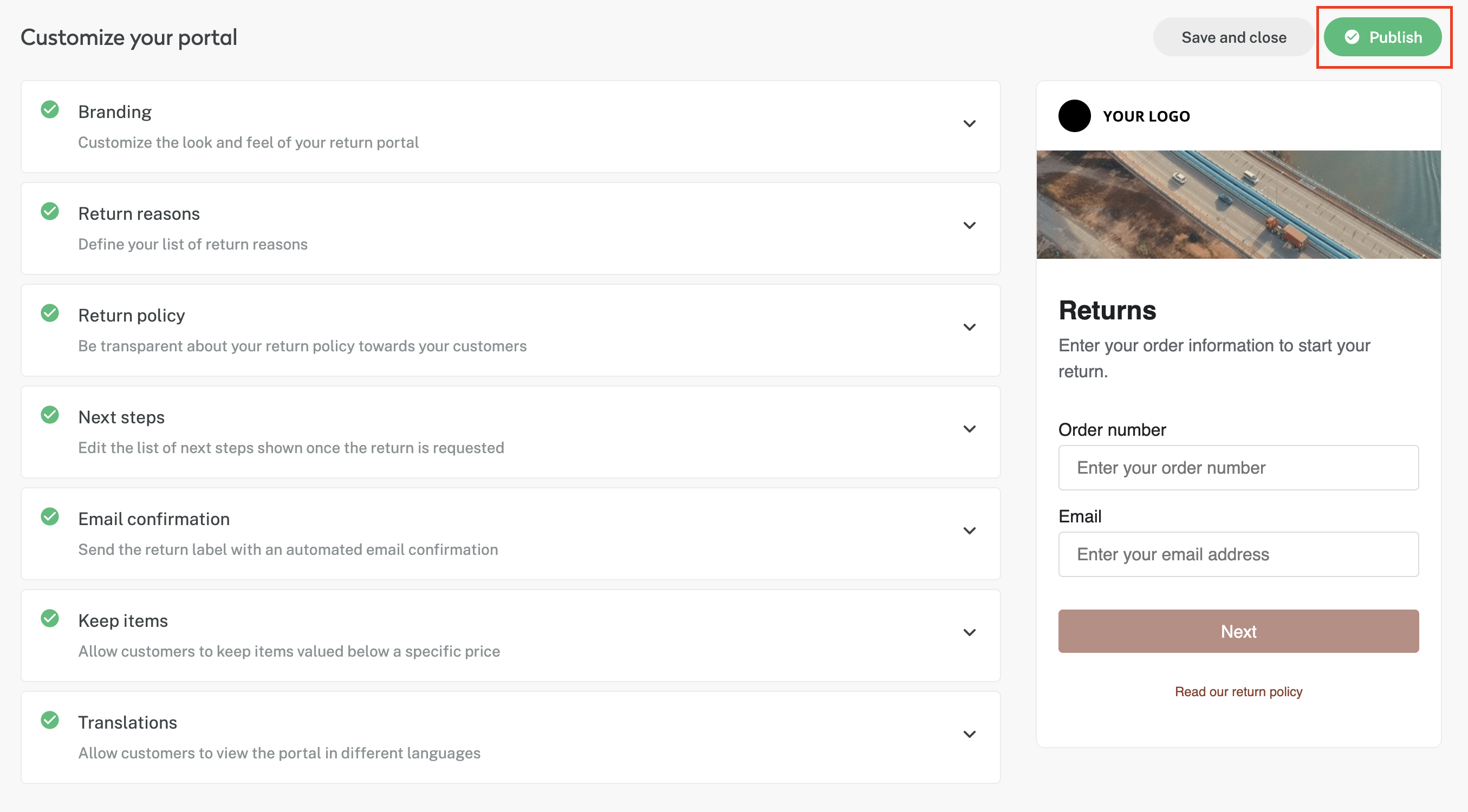 Once you have customised your return portal and all the required fields are completed, you will see a green tick next to each section of the editor. If all fields are ticked and the label specifications have been approved and implemented (meaning we can create labels on your behalf for the chosen country) you will be able to publish your portal. To do so, simply click the Publish button in the top right of your screen. You will then be provided with a live link to your return portal