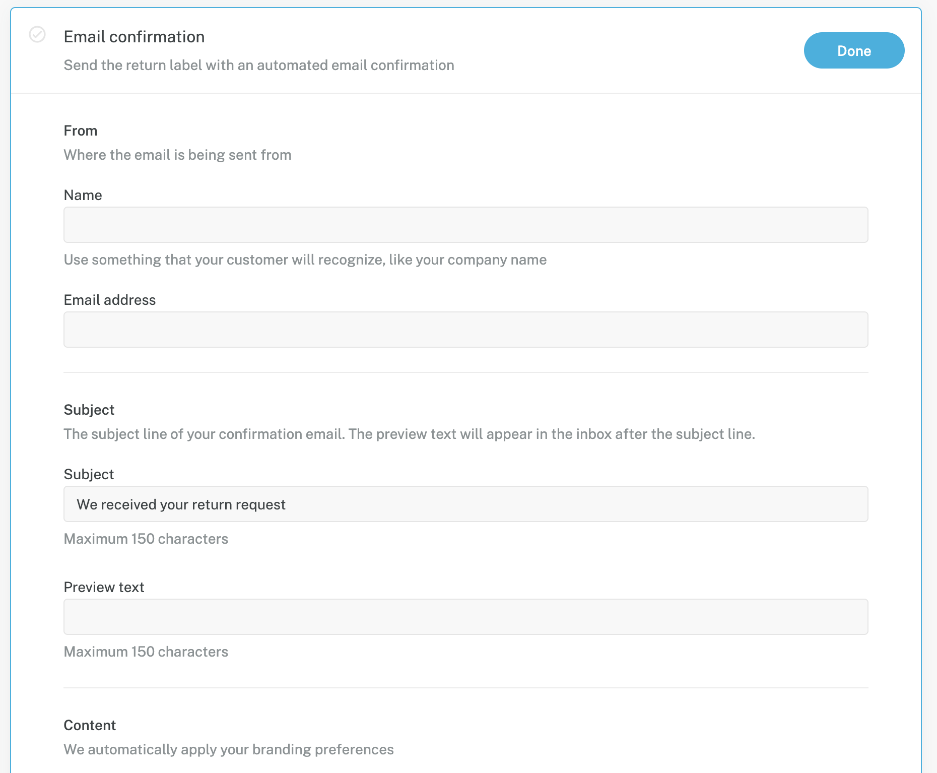 You can easily customise the content of the email in the return portal editor. The look and feel will follow the same patterns as the ones chosen for the portal (font, colour, logo...)