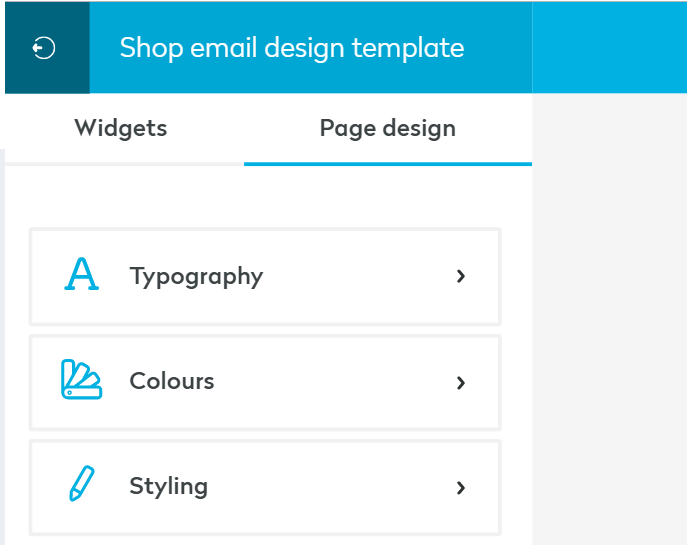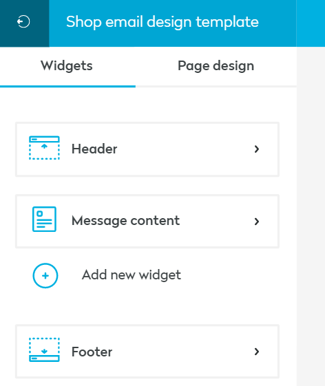 - Widgets: The Widgets tab defines the structure and content of the email. Widgets are displayed from top to bottom and can be edited individually.