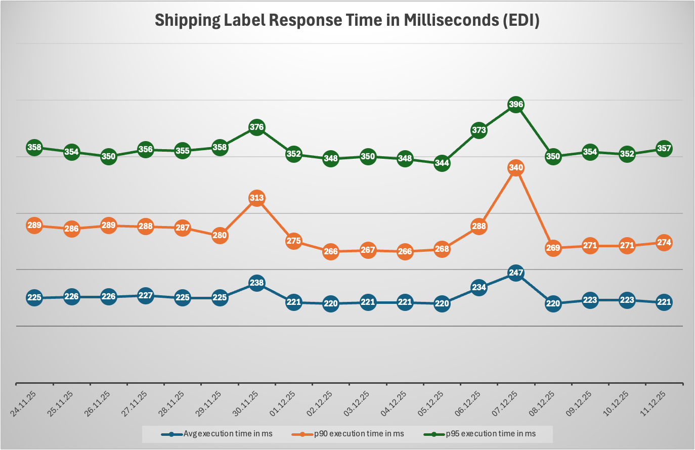 To illustrate our performance, below is the combined label generation speed that we achieved with our top 10 in-house EDI carrier integrations during the week of Black Friday and Cyber Monday. If you need more details about our carrier integration setup, please don’t hesitate to reach out to us.