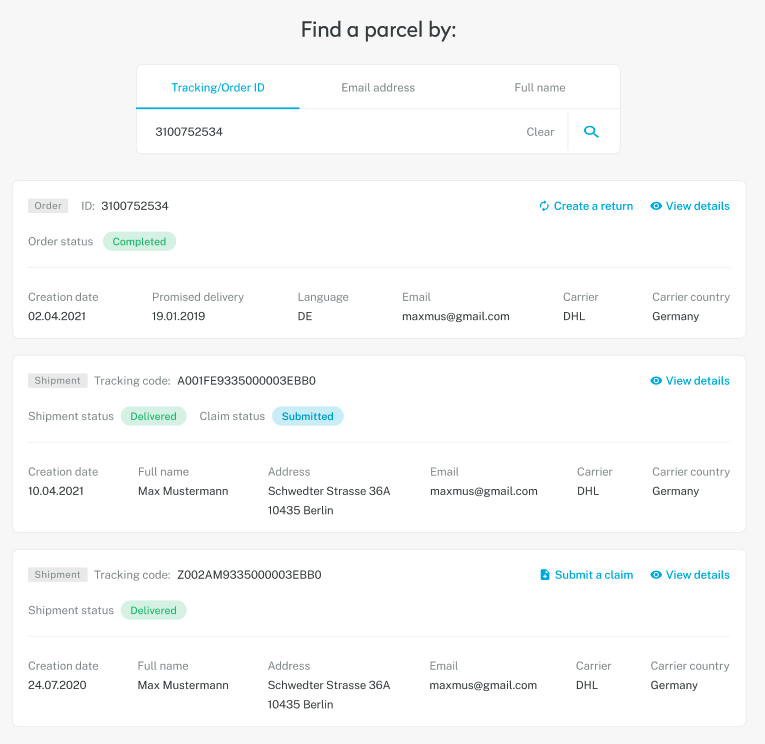 Enter the customer’s full name (first and last name, e.g., Max Mustermann) to display all related orders and shipments from the last six months.