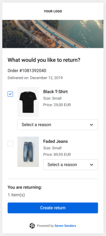 Our Return Portal improves the returns experience by delivering a branded, configurable, and localized interface that integrates with your existing Seven Senders order and shipment data. It replaces a printed return label with an intuitive digital workflow that guides the customer through authentication, return creation, and label download.