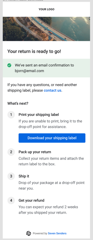 Once the user has requested the return and the label has been created, the user will see the confirmation screen, where they will be able to download the label. A confirmation email, also with the label, will be sent as well.